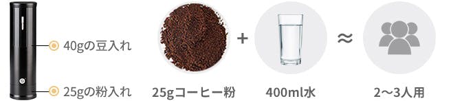 豆40g、粉25gの大容量収納です。粉15gで水200mlの分量を例に取ると、粉25gで水400mlを抽出でき、1回で2~3人分できます。いつでもご家族やお友達とおいしいコーヒーを共有することが可能です。