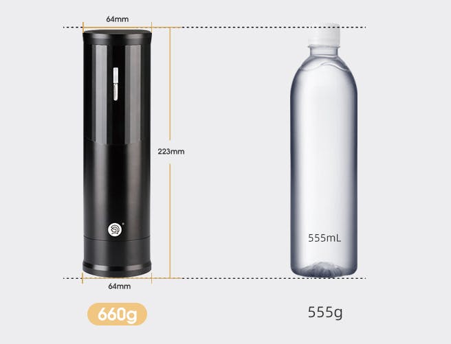 重量660g、サイズは64mm*64mm*223mmと、ミネラルウォーター1本分の大きさと重さと同じくらいで、リュックにすっぽり収まるサイズです。外出時、旅行、オフィスでの使用が非常に便利です。