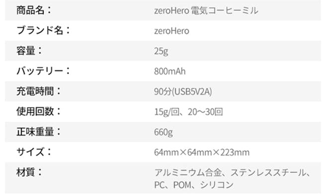A2:zeroHeroの電動ミルは、800mAhの大容量バッテリーを内蔵しており、長時間使用できます。1回の充電で約30回(1回15g)使用可能です。