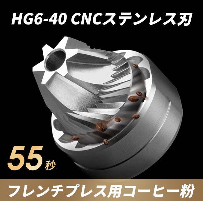 強力なモーターと自社開発したHG6-40 CNCのステンレス鋼の鋭い刃で、研削速度は非常に高速なだけでなく、迅速かつ均一にコーヒー豆を挽くことができます。最速55秒でフレンチプレス用の粉末が出来上がります。