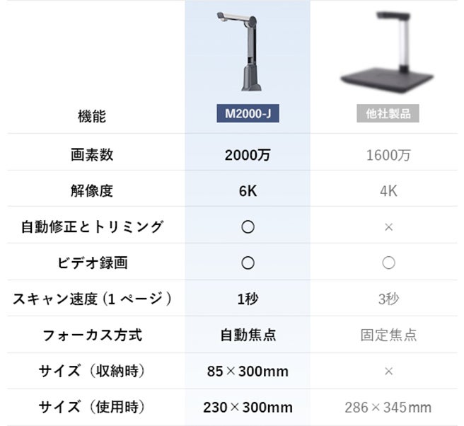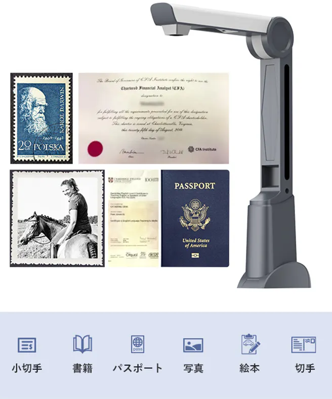 「M2000-J」は、最大A4サイズのコンテンツの読み取りに対応し、ドキュメント/請求書/書籍/証明書/絵本/写真/テスト用紙/図面などを鮮明にスキャンできます。