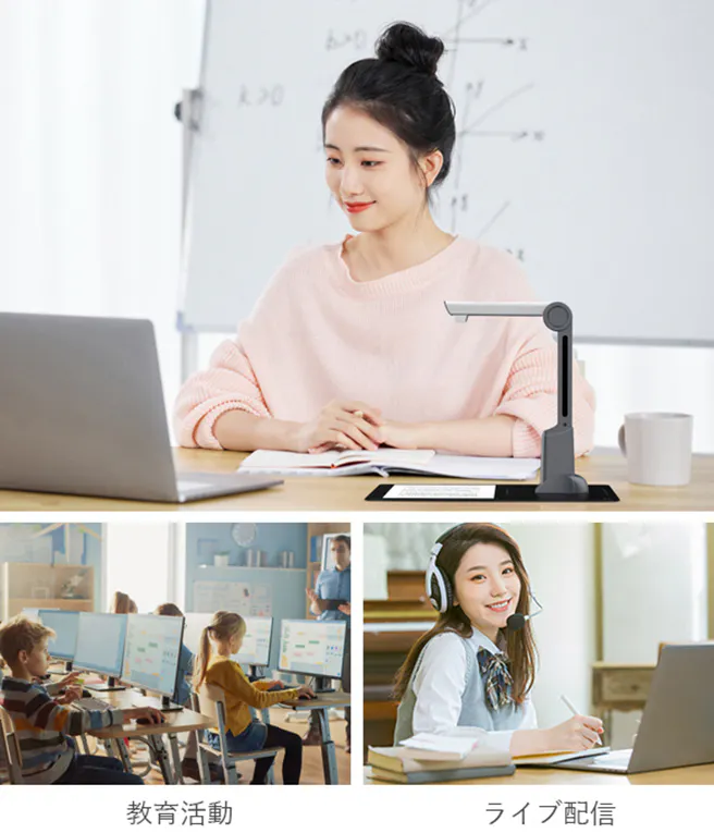「M2000-J」は単なるスキャナーではなく、リモートレッスン用の録画や配信用のカメラとして、オンライン授業のライブ配信、スピーチの準備や自宅でのリモートワークや授業に使用できます。