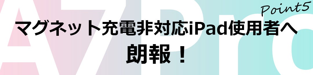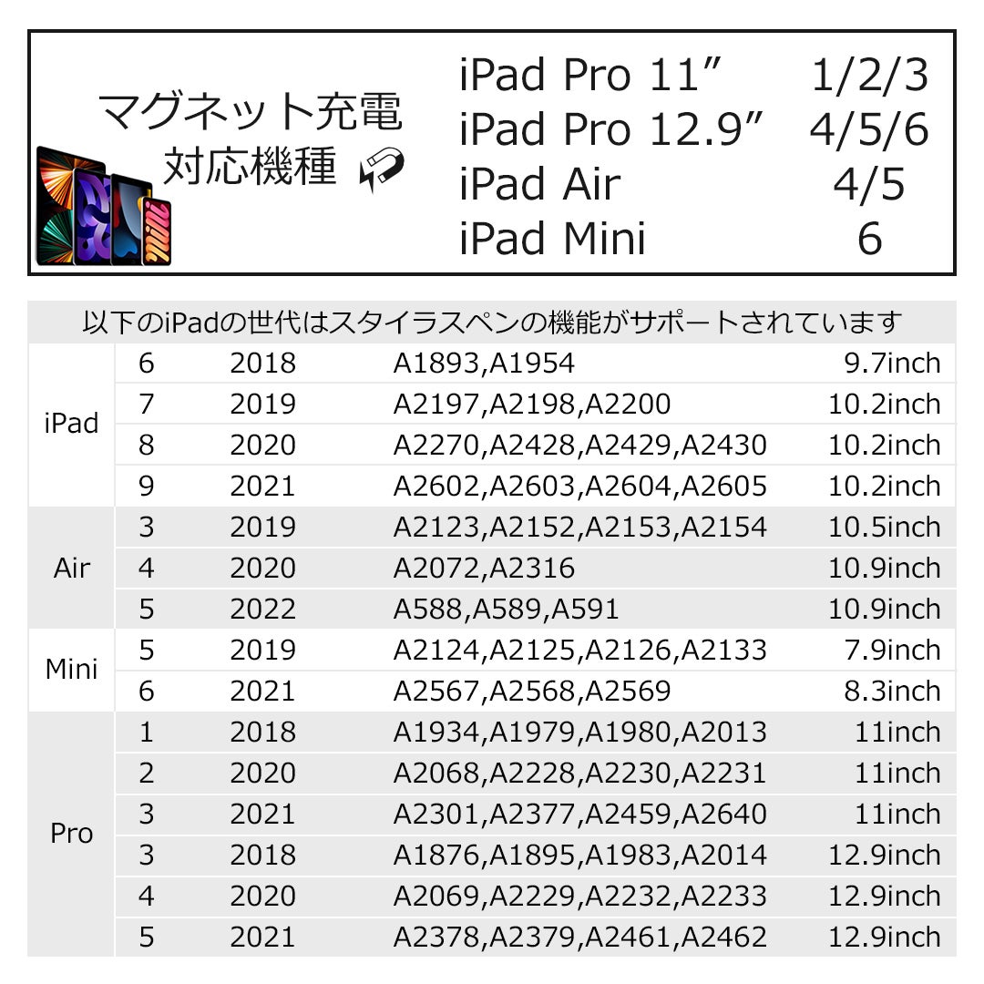 マグネット充電非対応世代のiPadも、上図のスタイラスペン機能はサポートされています。その世代はマグネット充電ができないため、リターンにある専用充電器をお買い求めください。