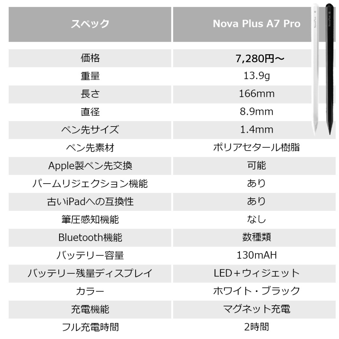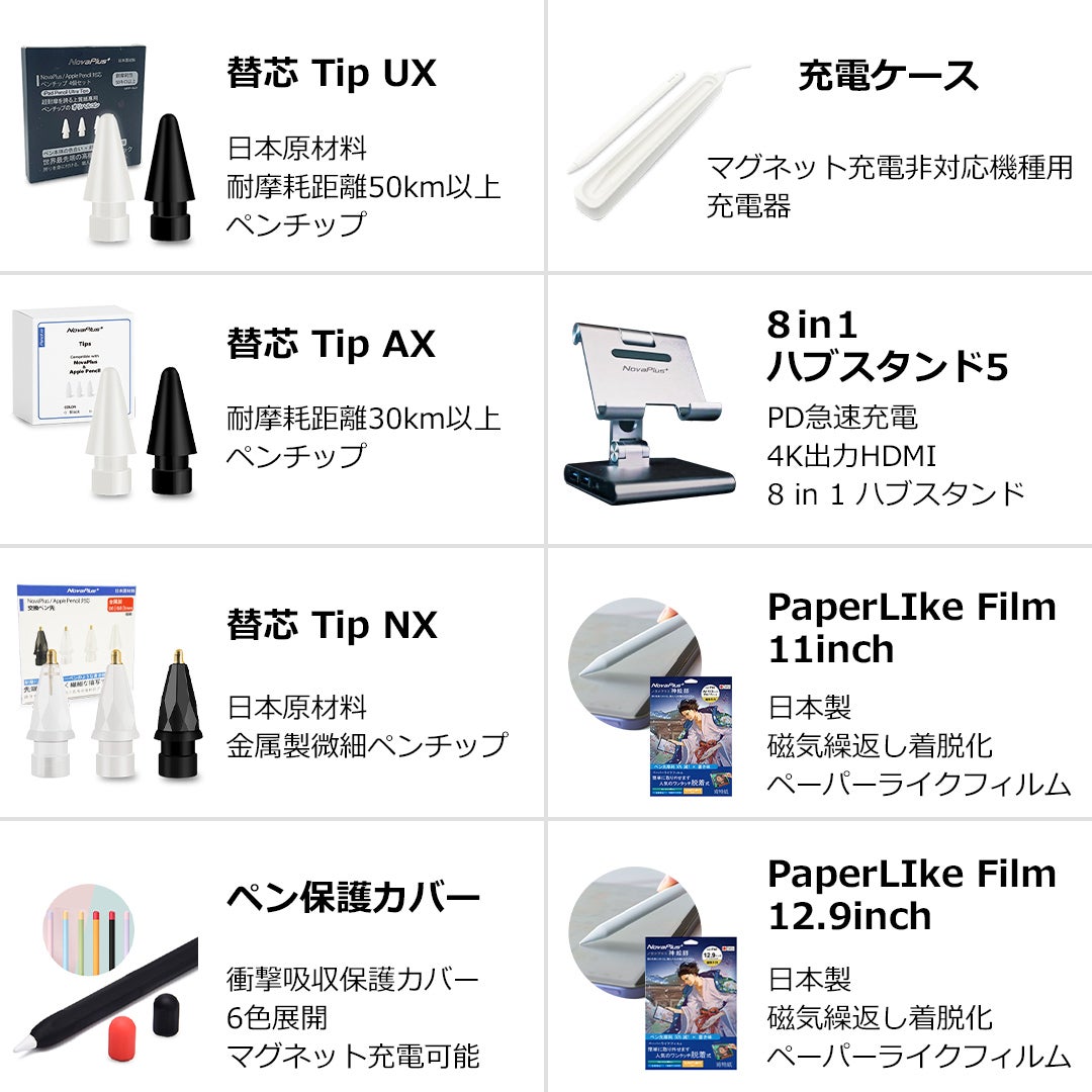 A. Nova Plus⁺のペン先を準備しております。なお、Apple Pencil 2 用のペン先は互換性があります。なお、リターンに含まれている金属ペン先はペーパーライクフィルムとの併用をおススメいたします。画面との弾力により、書いている線の途切れが発生する場合がございます。