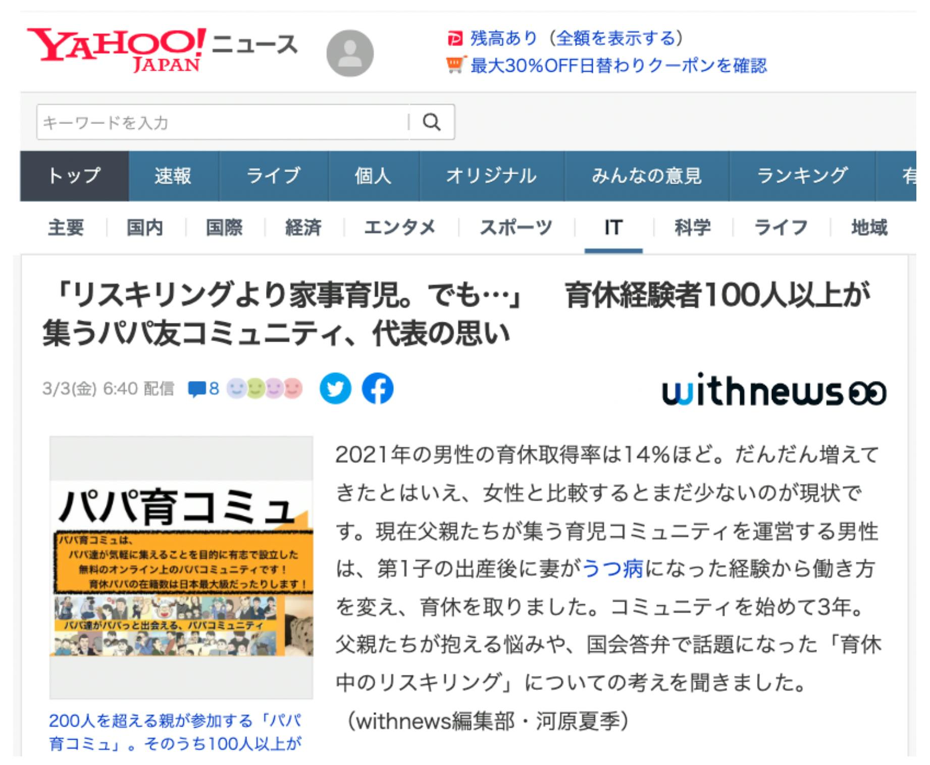 2023/03/03 12:30こんにちは、代表のシカゴリラです。まだまだマイノリティーなパパの育児について、河原夏季さん(@n_kawahara725)にwithnewsというメディアで記事にしていただきました。(Yahooニュースにも転載されました!)「パパと育児の距離は近くなっている」育休を取った父親が感じる変化 →Yahooニュースはこちら先日国会で話題になった「リスキリング」についても触れています。よろしければどうぞお読みください。******そしてクラファン最終日・・・目標まで残り1万円を切るところまで来ました。ひとえに皆さまのおかげです。本当にありがとうございます。そしてみなさまからの最後のご支援・拡散、どうぞよろしくお願いいたします! もっと見る
