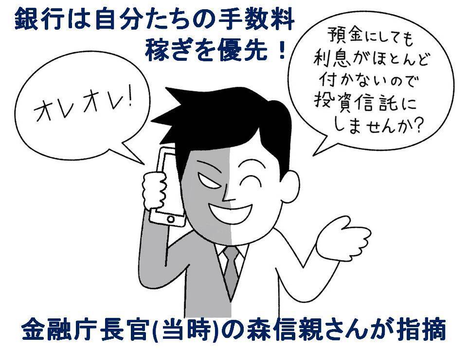 金融庁長官の森信親(もりのぶちか)さんが指摘されたように、銀行などの金融機関は顧客の資産形成よりも自分たちの手数料稼ぎを優先してきました。日本人が資産を形成できなかった原因の1つがそこにあるとのこと。