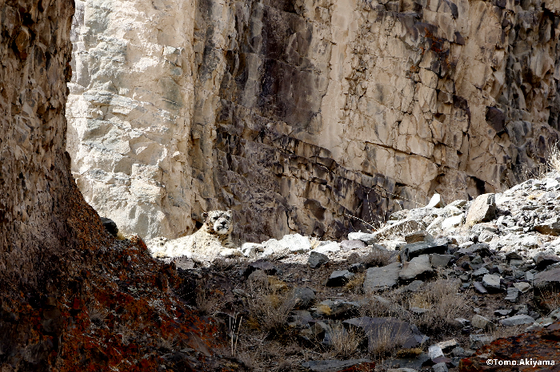 しかし、ユキヒョウは、寒さの厳しい山々に生息しており、行動範囲が広く、また警戒心がとても強いので、人間の足でユキヒョウを探すことは不可能です。
