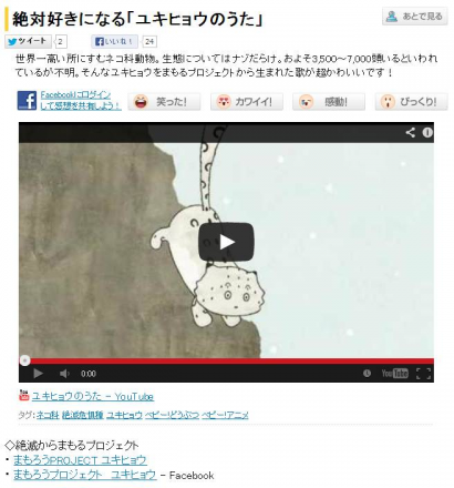 なんと、「ユキヒョウのうた」が、 Yahoo!映像トピックスに掲載されました! http://videotopics.yahoo.co.jp/videolist/official/music/p983255907651306cdd5ebf6ad8cffcbf この歌を通して、 たくさんの人にユキヒョウの魅力を知ってもらえたら本当にうれしいです。 引きつづき、野生のユキヒョウ保全につながるよう、 プロジェクトを頑張って進めていきます!! 応援&ご支援をよろしくお願いいたします><!!