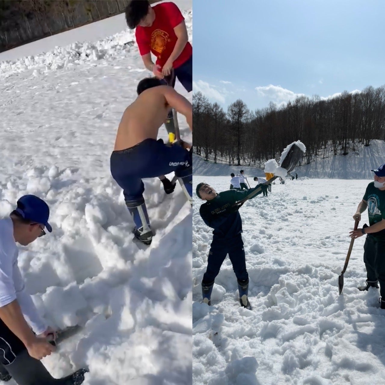 グラウンドをなるべく早く使用できるようにするため手作業で雪割、除雪をする様子