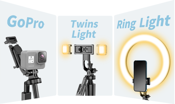 このように、スマホ以外の大多数のデバイスとも簡単に組み合わせることができ、撮影にさまざまな遊び方を提供します。カメラだけでなく、1/4"ネジ穴を持っていれば、しっかりと固定できます。