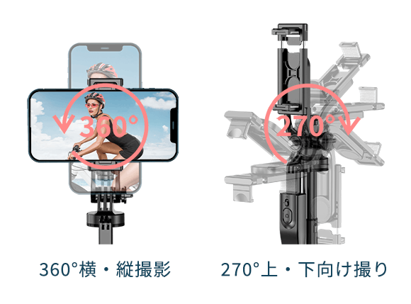 「TOKQI-L16」は横・縦画面の360°手動切替に対応しており、必要に応じてスマホを調整することができます。さらに上部のつまみにより、スマホの撮影角度を自在に調整できます。縦方向に最大270°まで回転可能!スマホの角度を変えることで、より多様で楽しい撮影ができます。