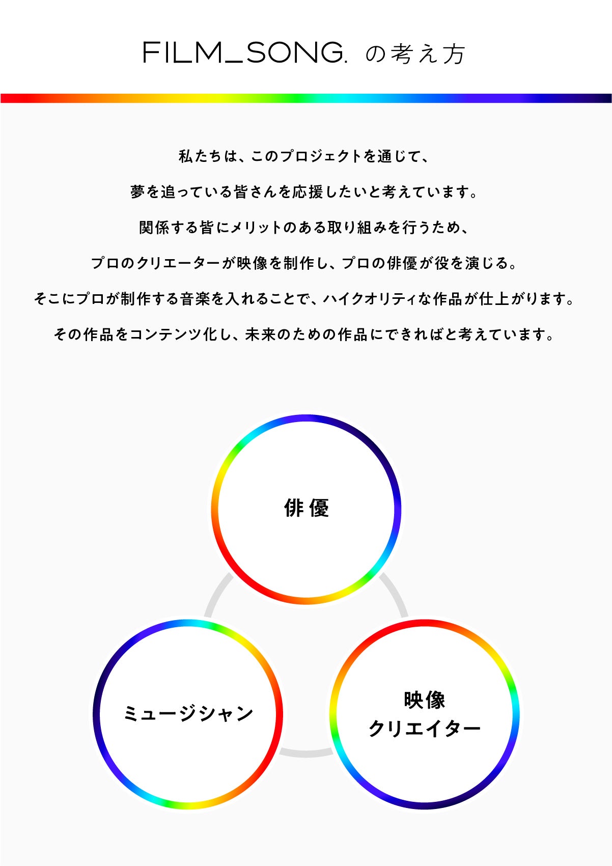 俳優、ミュージシャン、スタッフの活動できる場所を提供しFILM _SONG.を通したスター誕生を目指す。映像出演や告知活動などを通して参加メンバーのファン獲得をサポートしていきます。