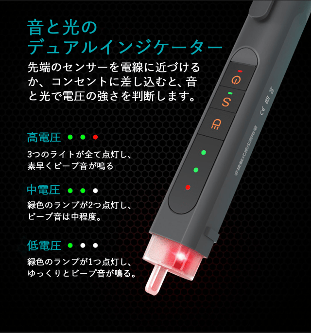 ■電圧測定:測定した電圧の強さを3段階で音と光でお知らせします。