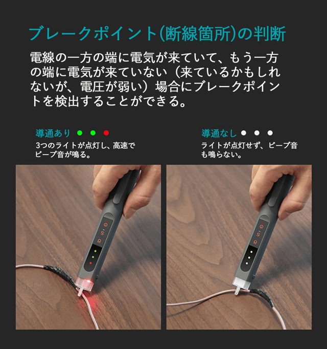 ■断線検知機能:ライトの点滅の数量と音の強弱で導通有無をお知らせします。