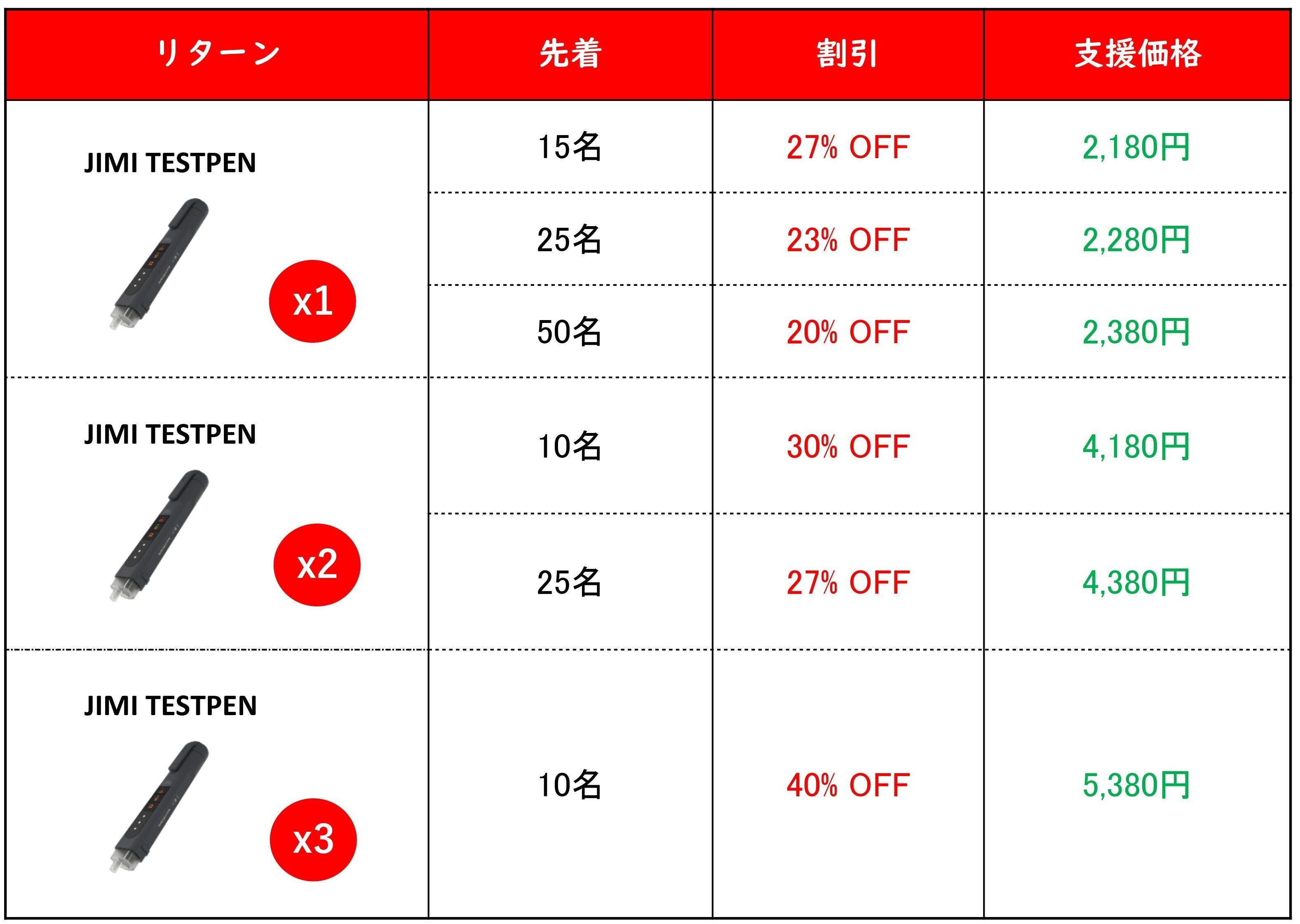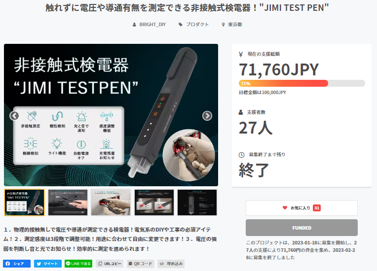2023/03/01 18:56支援者の皆様、Brightチームです。お世話になっております。プロジェクト開始から41日目で27人もの支援者の方々よりご支援を頂き、無事プロジェクト終了を迎えることが出来ました。早速皆様のリターンを2023年04月にお届けできるよう準備を始めております!皆様にご満足いただけるリターンをお届けできるよう、全力で取り組んで参りますので引き続き、触れずに電圧や導通有無を測定できる非接触式検電器!"JIMI TEST PEN"をよろしくお願い致します。Brightチーム もっと見る