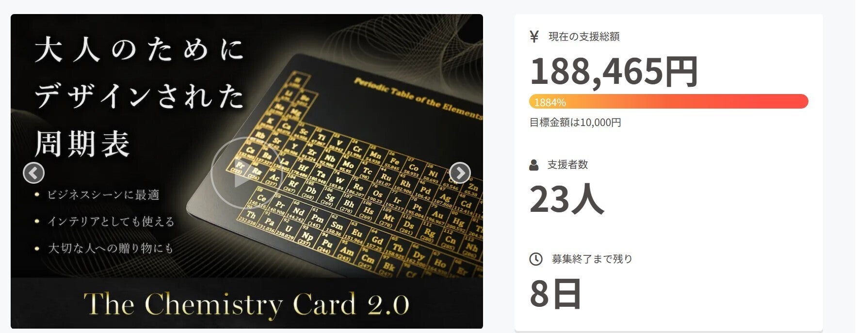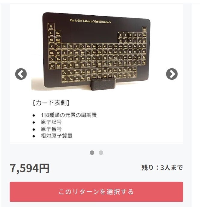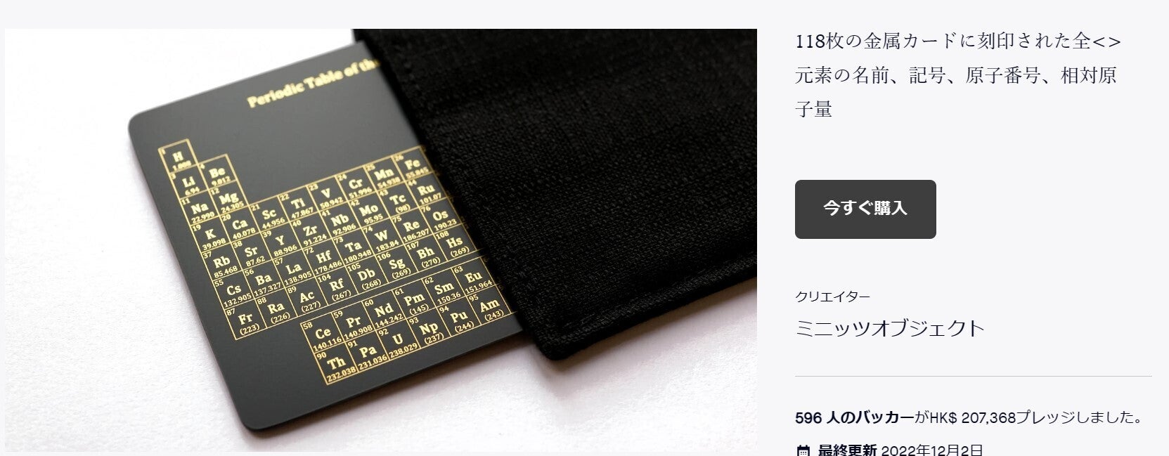 おはようございますhttps://camp-fire.jp/projects/view/644164残り4日の期間となりました…今日は、メーカー様の根強いファンの方たちについてお話しをさせていただきます。The Chemistry Card 2.0の制作を担ったデザイン会社「Minute Objects」には根強いファンの方々がいらっしゃいます。ファンの方々は「Minute Objects」 の商品を続けて購入していらっしゃいます。★ 良い構造と素晴らしい品質!情報の宝庫があるのは心強いです!★ すべてのメタルカードは、永遠に続くように、見た目も気分も本当に素晴らしいです! 金属カードに周期表を入れて持ち歩くこと、 ただ「何か」があります。 ★ いつものように、すべて良いです。感謝。 ★ いつものように優れた品質。幸せな支援者 ★ 素晴らしい作品です!途方もない仕事。ミニッツオブジェクトチームに感謝します。 次のプロジェクトを楽しみにしています! ★ 私は特に彼らの周期表が好きです!他のカードもとても便利で、どこへ行っても持ち歩いて います。 このような品質は他では見つかりません!感動するでしょう! ★ ねえ、私はあなたの新しいキャンペーンをバックアップしました。 ケミストリーカードをバックアップした以前の経験から、あなたは健全で堅実で信頼できる Kickstarterプロバイダーであることが証明されています。 私は本当にあなたにすべての成功を願っています、あなたはそれに値します。★ ミニッツオブジェクトは非常に立派で信頼できる ★ あなたのプロジェクトで再び支援者になれてうれしいです! ★ なんて素晴らしい品質、どうもありがとうございました。「Minute Objects」 の販売ページを見ていると私は何時も幸せになります。ファンの方々の感想は喜びの声ばかりです。世の中には沢山の商品が溢れていますが、この様に受け取った方たちの喜びの声にあふれている商品はなかなかありません。幸せを運ぶカードThe Chemistry Card 2.0 最後の4日間になりました。https://camp-fire.jp/projects/view/644164