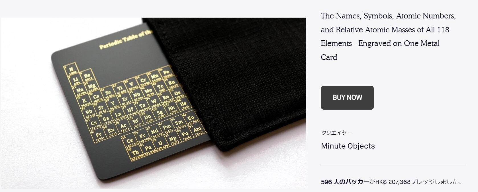 おはようございます。https://camp-fire.jp/projects/view/644164今日は、The Chemistry Card 2.0を作成するにあたって一番苦労したことは何ですか?とメーカー様に聞いたお話しをさせていただきます。The Chemistry Card 2.0を作成するにあたって一番苦労したことは、レーザー刻印だったそうです。Minute Objectsは 2020年に『小さいながらも壮大なオブジェクトをデザインする』というコンセプトを元に設立されたデザイン会社です。 信頼できるものづくりの工場と、そして多種多様なクリエイターとともに、アイディアに溢れた商品の数々生み出しています。こちらの動画は約4倍のスピードで流しておりますが、実際は1枚に全ての情報を刻印するのは、もっと時間のかかる作業です。そして、この様な技術を持っている企業と出会う為にも多くの時間をついやしたそうです。そして、The Chemistry Card 2.0 の表面を滑らかに仕上げるのにも苦労が必要だったそうです。The Chemistry Card 2.0の表面の手触りはレーザーで刻印しているのに凹凸が無いのです。とても滑らかです。The Chemistry Card 2.0の表面 を初めて触った時にレーザーで刻印しているにもかかわらず凹凸が感じられない事には驚きました。美しいレーザーの刻印を実現する 為に時間をかけて誕生したThe Chemistry Card 2.0 メーカ様にとっては宝石の様な一品のでしょう今日はThe Chemistry Card 2.0を作成するにあたってのメーカー様の苦労話しをお伝えさせていただきました。https://camp-fire.jp/projects/view/644164