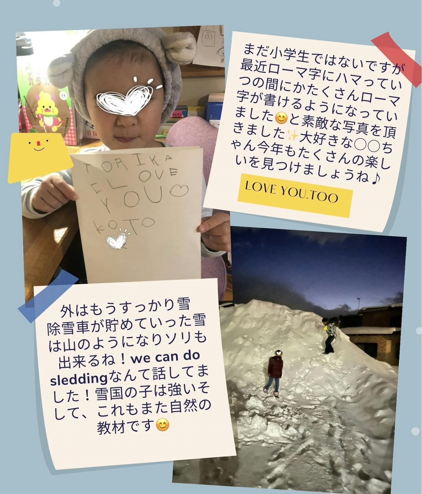 レッスンに来ている子どもたちからは、いつもお手紙や絵をもらって、まだ小学生前の子は最近ローマ字にハマってますと、お家で可愛い可愛いお手紙を書いてくれたり♡