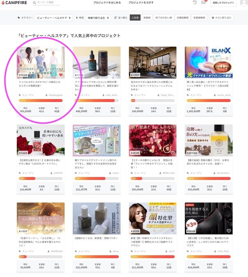本日の段階で「ビューティー・ヘルスケアで人気上昇中のプロジェクト」としてトップに、また「人気急上昇のプロジェクト」としても上位に掲載してもらいました。