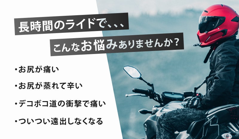 世界中のバイカーの悩みは、お尻の痺れ、痛みです。お尻が痛くて、⾛⾏距離に制限がかかっている⼈も多いはず。エンジンの振動や険しい道の衝撃、⻑時間同じ体制でいる事で同じ場所に負担がかかり続ける事が原因です。