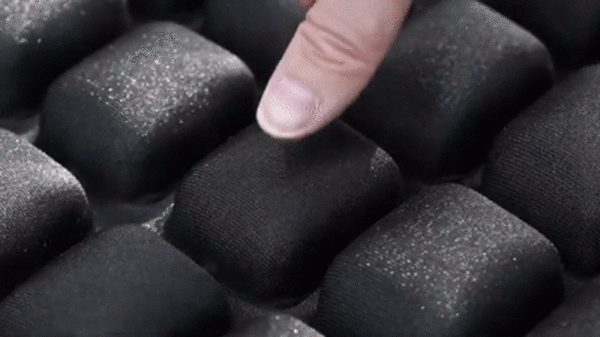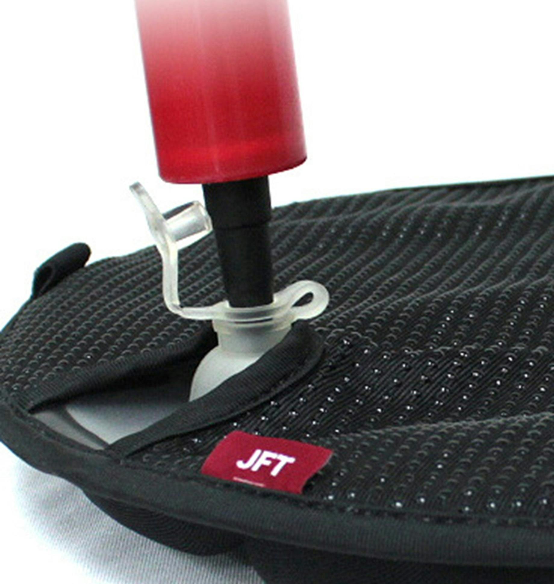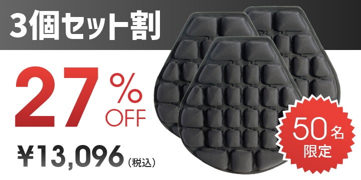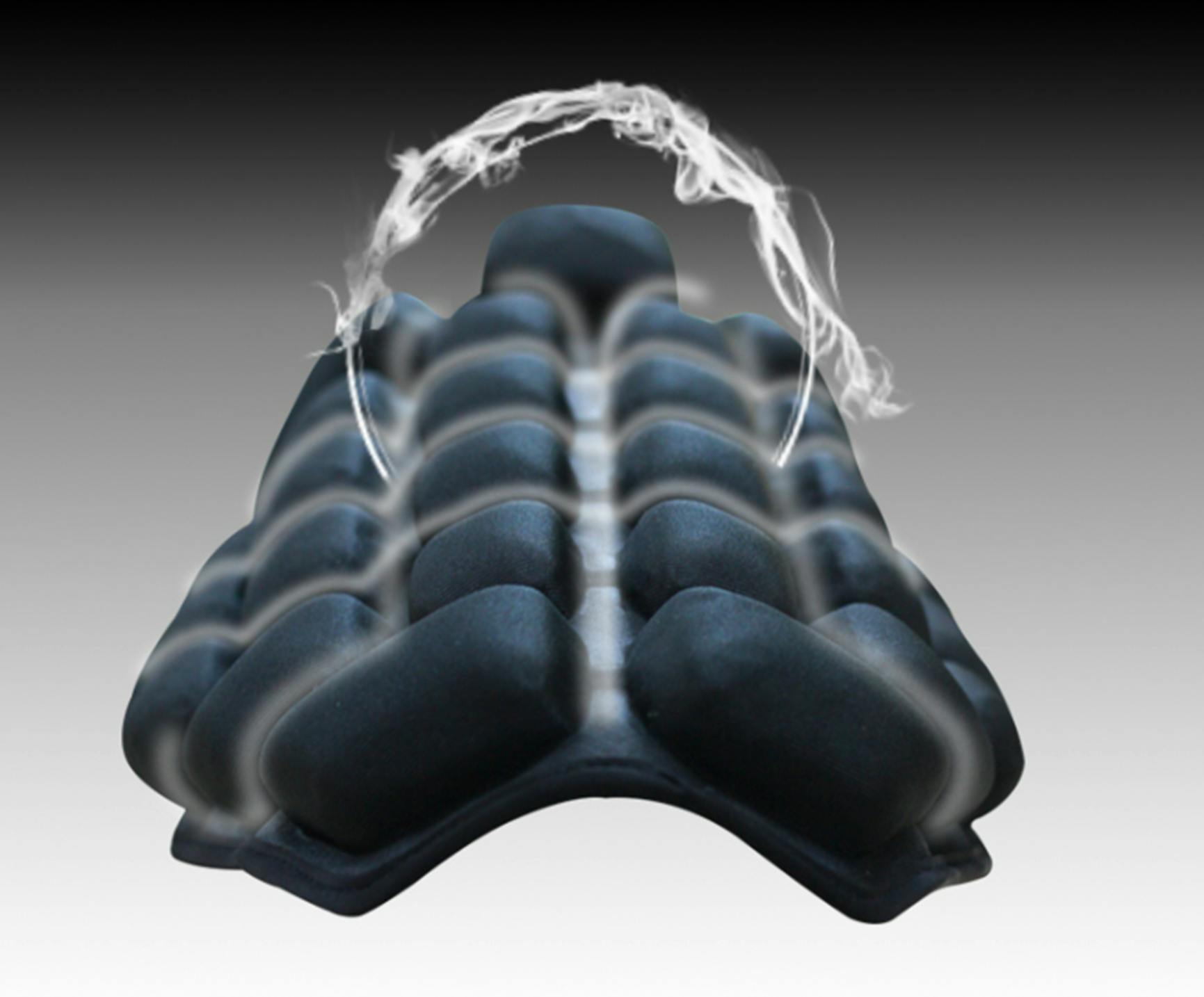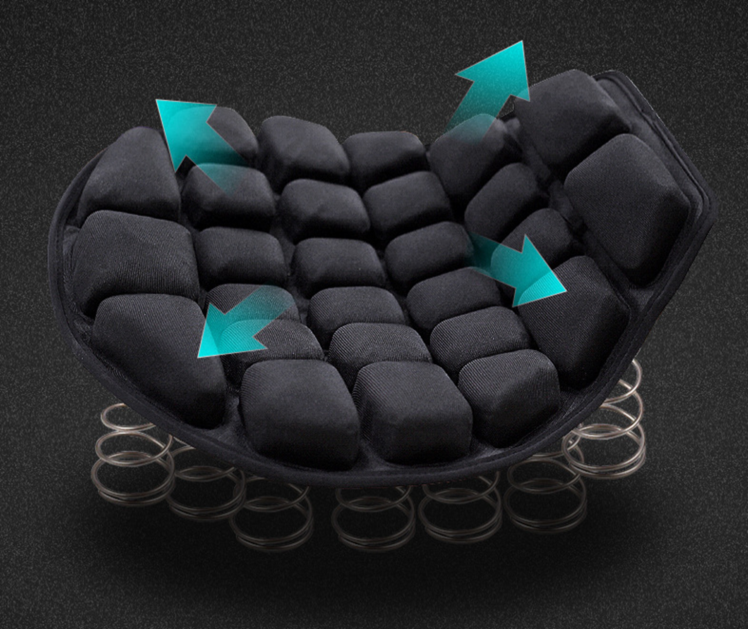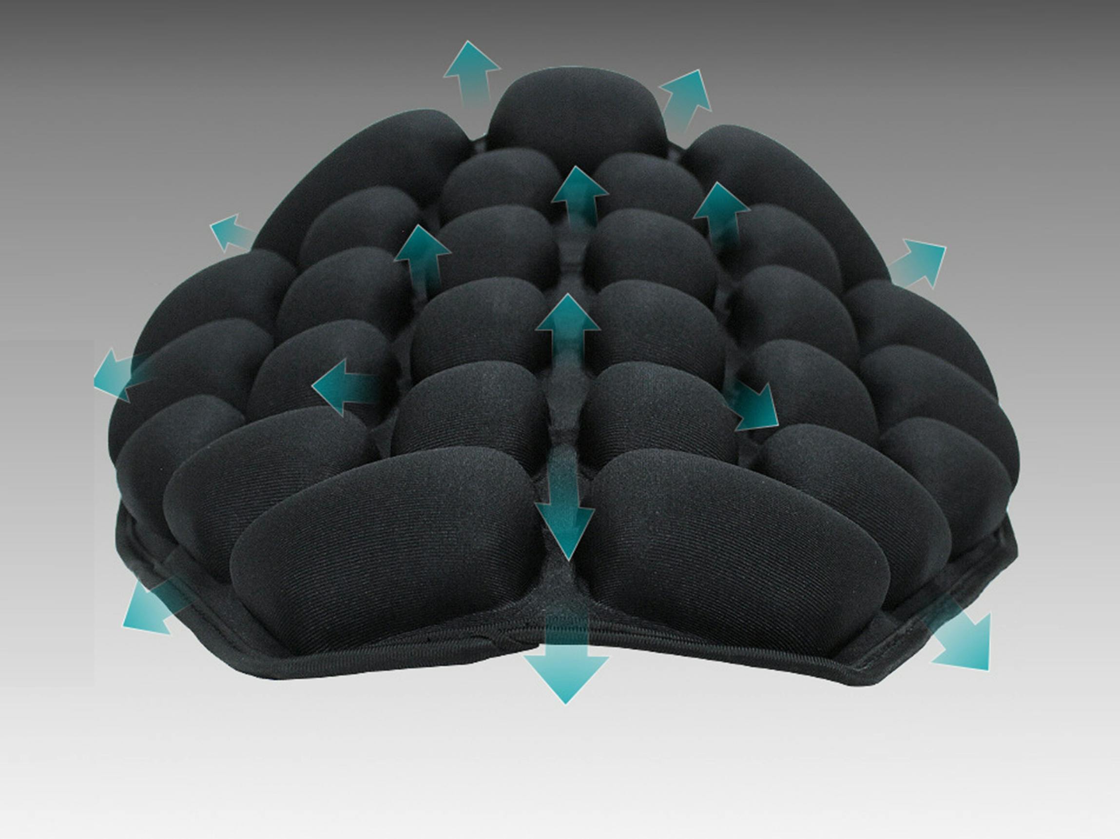圧⼒が掛かると27個のエアパッド全体に空気が均⼀に分散し、衝撃に合わせて空気が流動し、お尻の接地⾯にかかる負担が最⼤80%軽減されます。