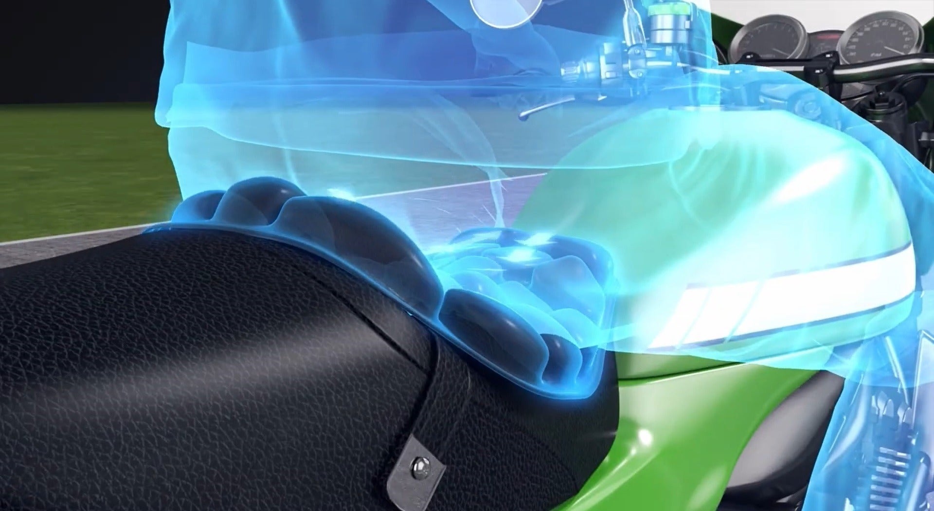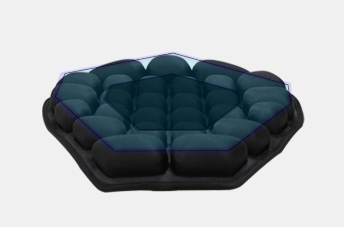 バイクの運転中にシートに最も触れるのは中⼼部と外側です。エアパッドは柔らかいだけではなく、「中⼼部は低く、外側は⾼い」設計で様々なライディング姿勢にフィットします。