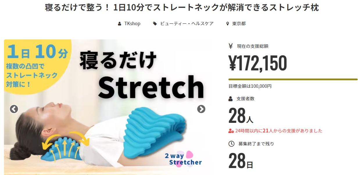 皆様こんばんは。「2wayネックストレッチャー」の公開期間が残り8日となりました!スタッフ一同、気合十分でラストスパートに望んでおります。 ところでみなさんは「枕難民」という言葉、ご存知でしょうか?快適な眠りや、首・肩のこりを解消するためにいろんなまくらを試しているけど、なかなか解決できない人をいいます。最近はオーダーメイドの枕が作れるお店もあるため、そういった専門店で何万円もかけて買う方も珍しくありません。 もしあなたが首のこりを解消したくて枕を探しているならば、ぜひ「2wayネックストレッチャー」を試してみてください!オーダーメイド枕の数分の1の費用で悩みが解決できてしまうかもしれませんよ♪ 1点だけ注意点があります。本商品はあくまでもストレッチ器具のため、1日10分を目安に使用いただいております。ストレッチが終わったらご自身のいつもの枕でおやすみしてくださいね。 それでは公開終了まで更なる応援をお待ちしております!使用方法が分かりやすく説明された動画があります! こちらも参考になさってくだいね。【使用方法】(理学療法士が教える、寝るだけでととのう首まくら)https://www.youtube.com/watch?v=FiaaxZUQg5g&t=22s