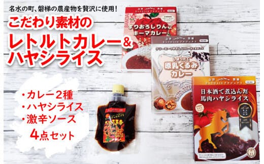 カレー2種(原乳くるみカレー・すりおろしりんご)、ハヤシライス(馬肉ハヤシライス)、激辛ソース(ブートジョロキアソース)の4種類セットです。個装なしでネコポスにて発送します。