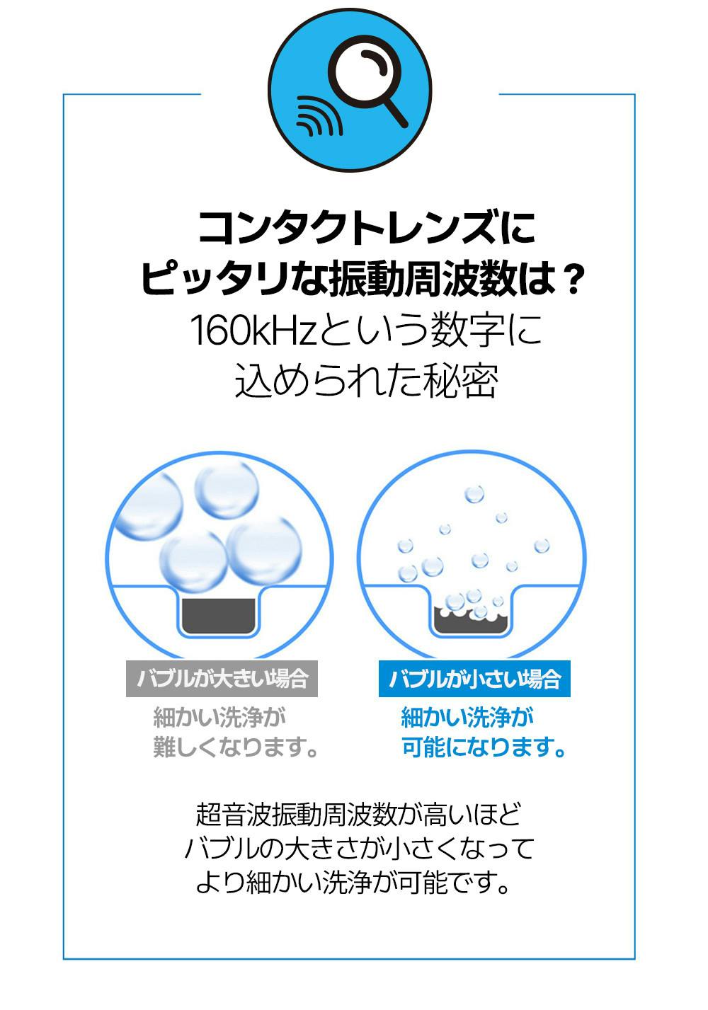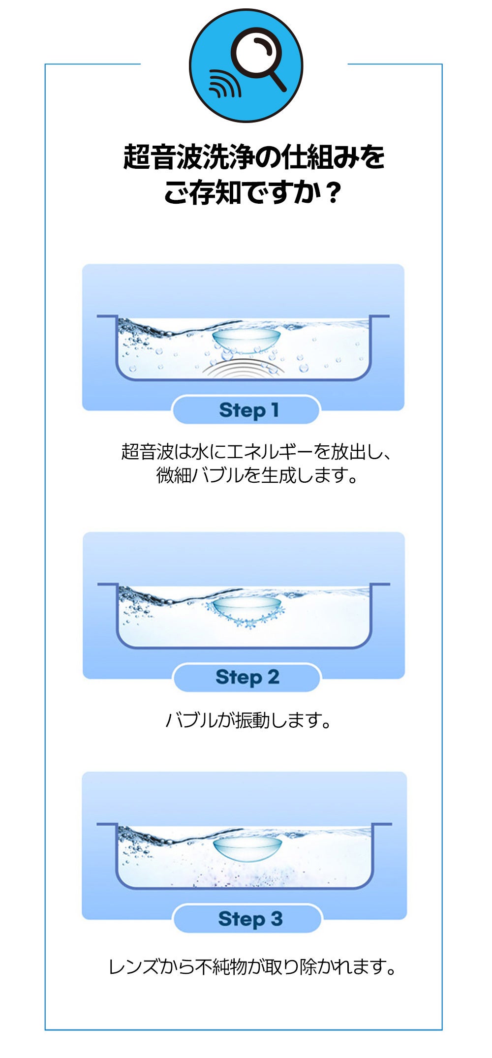 1秒当たり160,000回振動する超音波が微細なバブルを作り、レンズ表面にあるタンパク質と汚染物質、細菌まできれいに洗い流します。