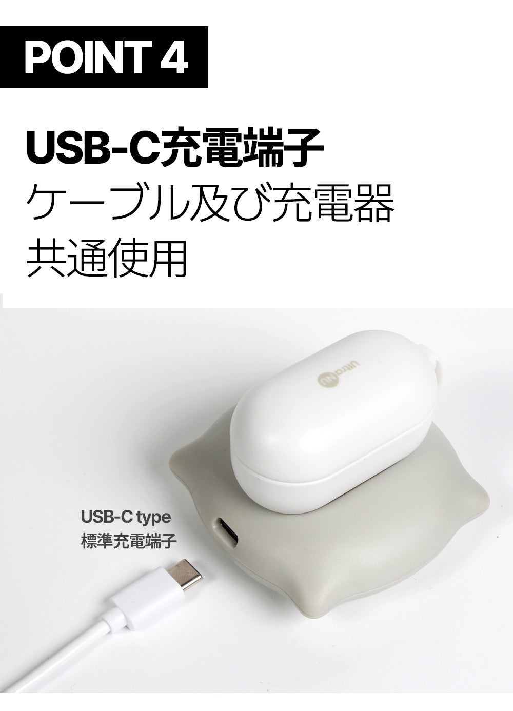 標準充電端子であるUSB-C充電端子を採用し、他の電子機器と充電器およびケーブルを共用で使用できます。
