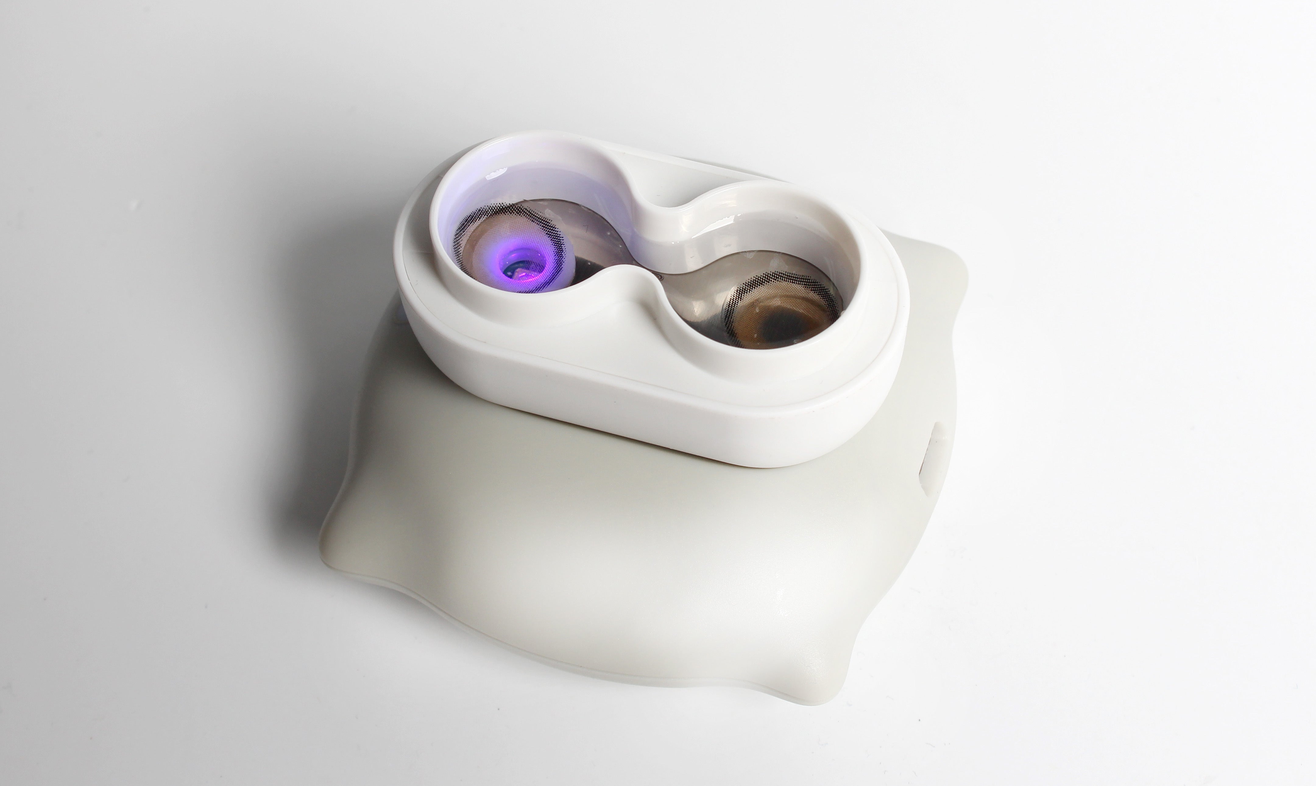 A、UV LEDが水槽内の片方だけでも、両方のレンズが同じように隅々まで除菌されます。理由としては、本製品の除菌方式がレンズに直接UVを当て、除菌する方式ではなく、超音波でレンズ表面の老廃物と細菌を水で洗い流した後、水槽内の溶液をUV除菌する、ダブルアクション方式だからです。こちらの点が従来のレンズ除菌&洗浄機と最も差別化された点になります。