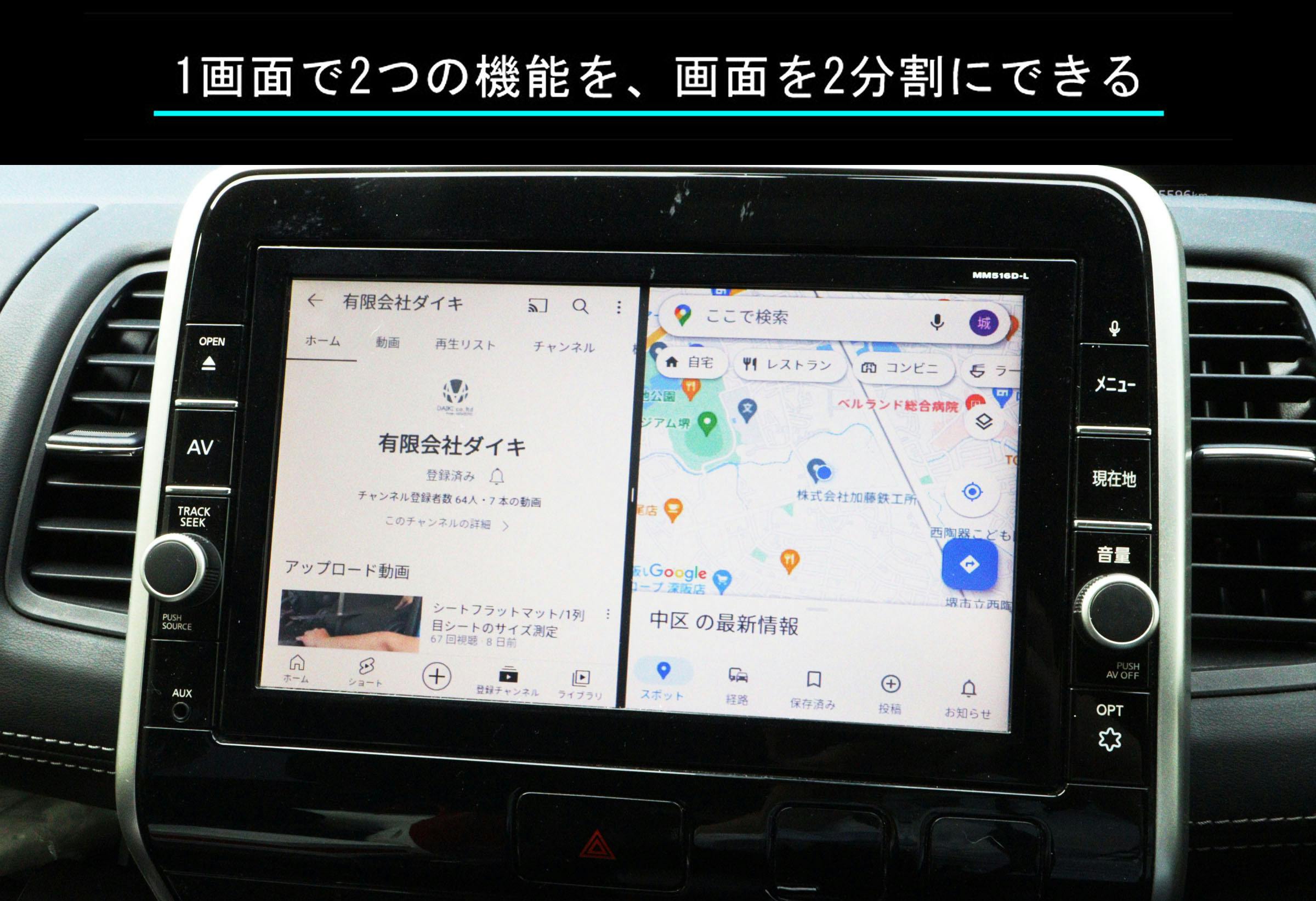 なんと画面を二分割にすることが可能に!運転している方はナビを見ていても、助手席の方は動画を見る!二人で一つの画面を共有することが出来ます!