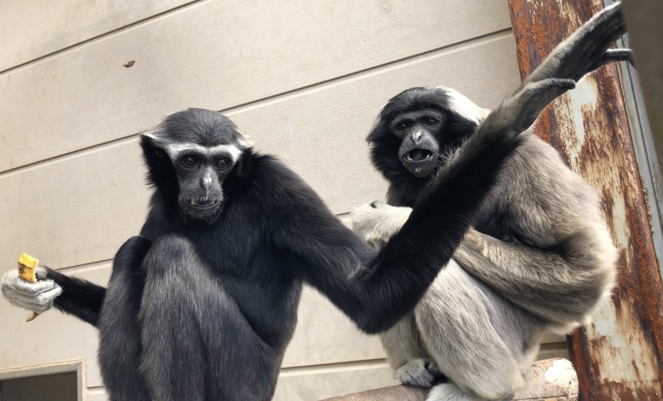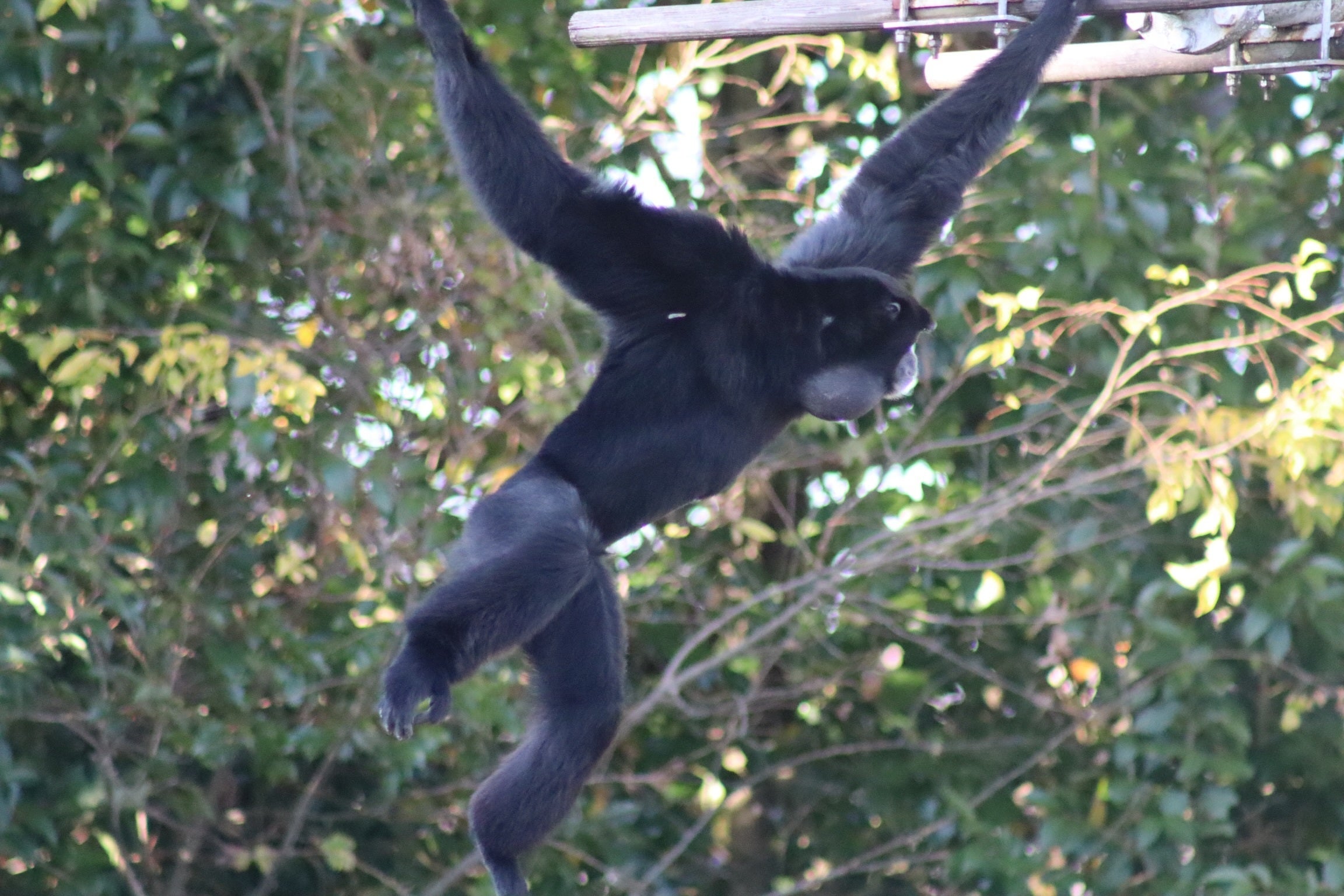 キボンハウスには、ボウシテナガザルのカン・カナコ・トリックの3頭が暮らしています。