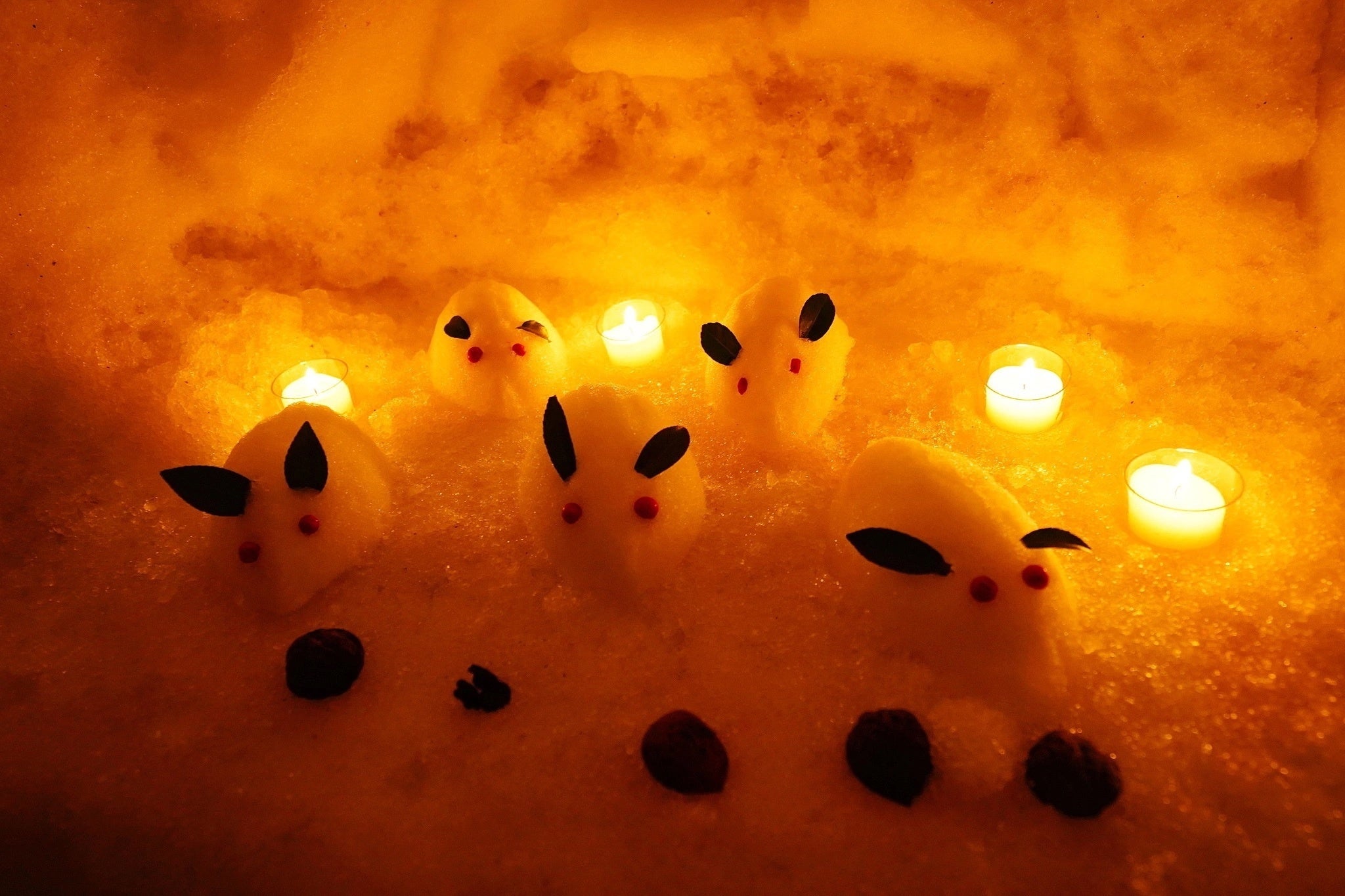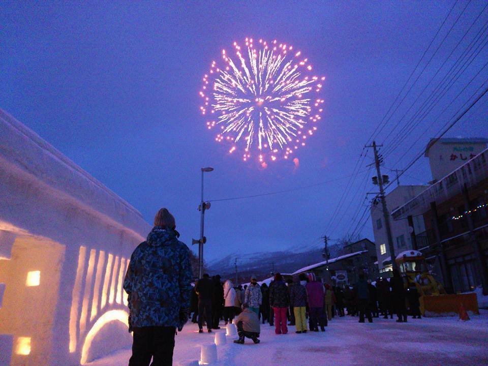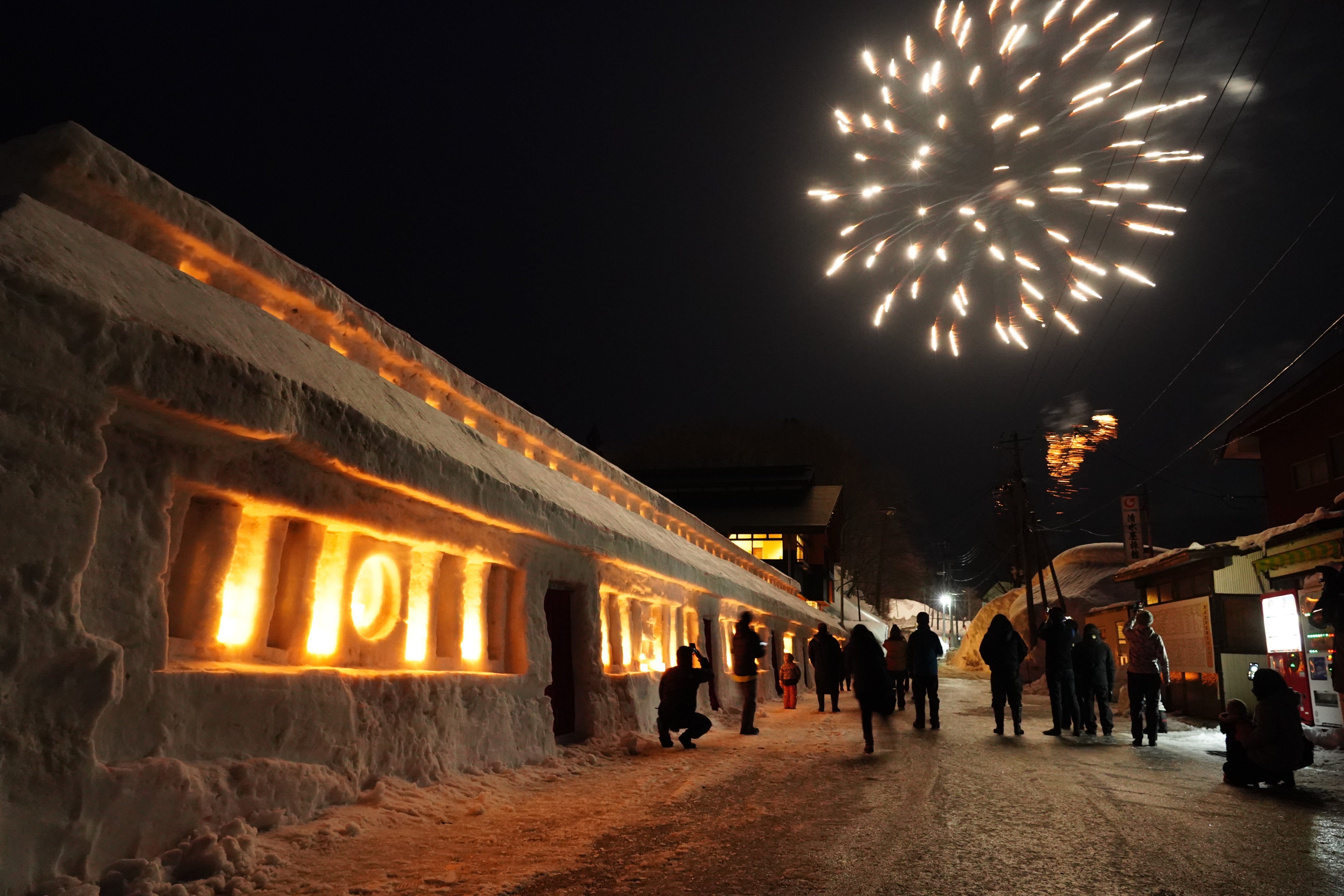 雪と蝋燭で彩られた世界に、空高く打ち上げられた冬の花火は儚くも美しい光景です。