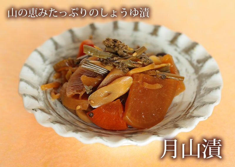 「月山漬」とは……ふき・みず・筍・ぶなしめじ・わらび・大根・人参など山の恵みを醤油で漬け込んだ山形のお漬物です。