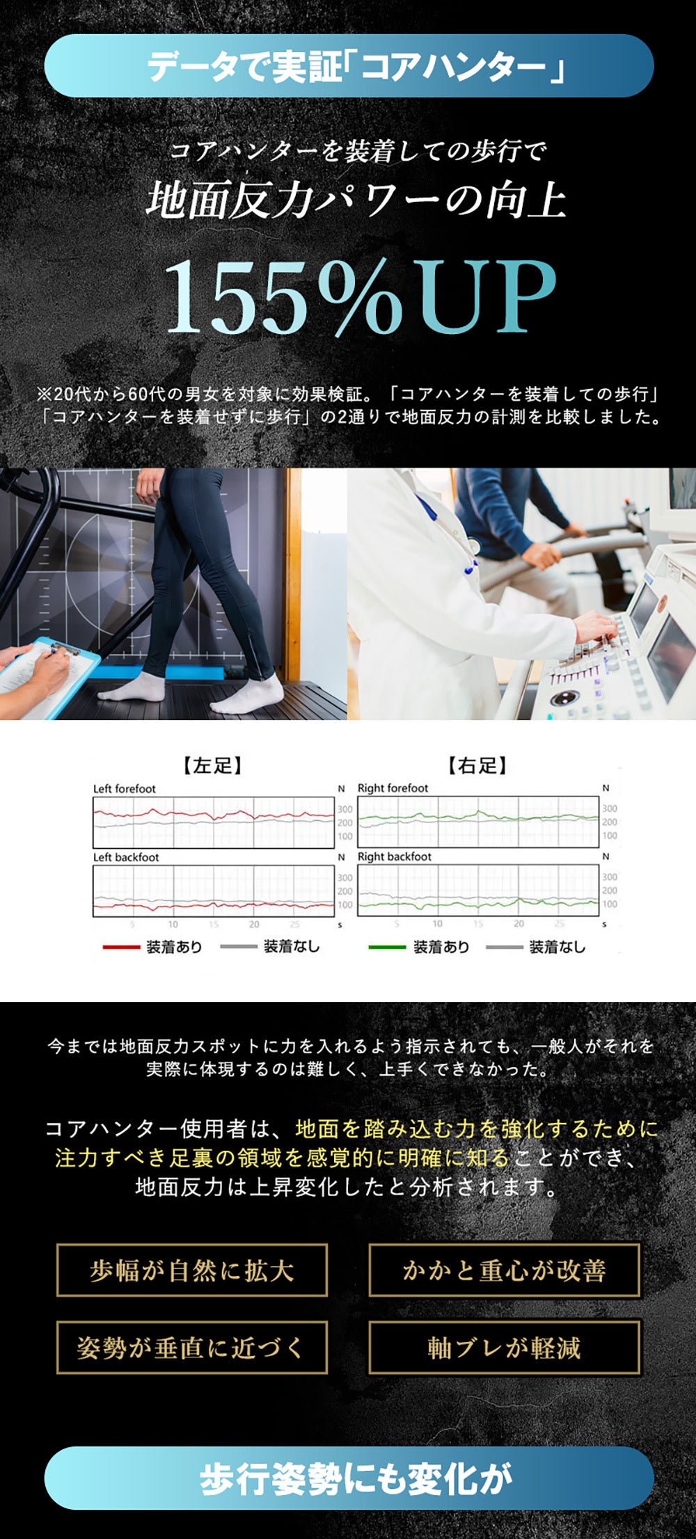 ②足裏のアーチをサポート、地面反力を155%アップして歩行をサポート