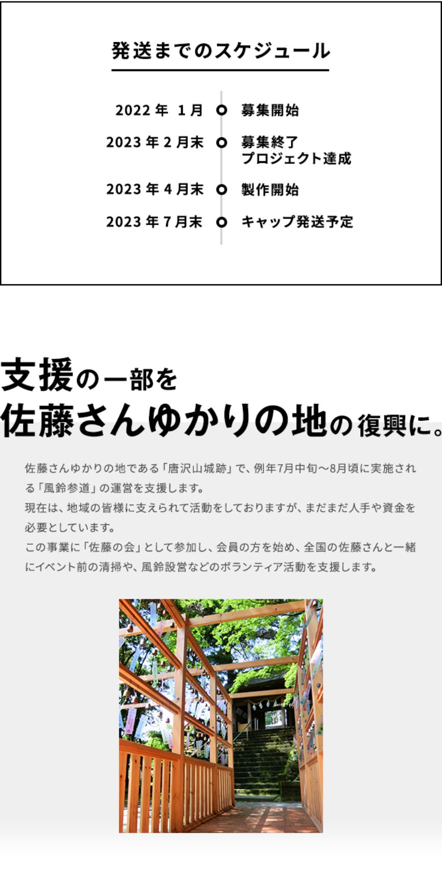 2023/02/25 12:00皆さまからの温かいご支援により、本プロジェクトは目標を大幅に超えて達成することができました。本当にありがとうございます。「こんなグッズをまっていました」「佐藤さんでよかった」などたくさんの応援コメントもいただき、製作に入ることができるのが嬉しいです!NEW ERA®の佐藤さんキャップが手に入るのはこの機会だけですので、さらなる飛躍を目指すため、ぜひ、プロジェクトページをSNS等でシェア・拡散していただけますと幸いです。https://camp-fire.jp/projects/view/644396皆さまのお力添え、よろしくお願いいたします。また佐藤の会では佐藤の会にとって大切な3月10日佐藤の日に合わせて、2023年3月12日 午後5時から公式YouTubeチャンネルで生配信を実施します。https://www.youtube.com/@user-tw1sn9cx2h著名な佐藤さんが集まって、達成結果報告や佐藤さんゆかりの地佐野市を紹介しますので、こちらもぜひご覧ください! もっと見る