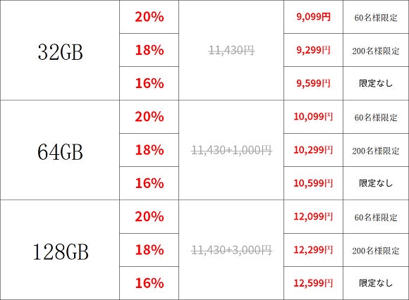 ※64GBの価格は32GBから1,000円、128GBの価格は32GBから3,000円プラスになります。