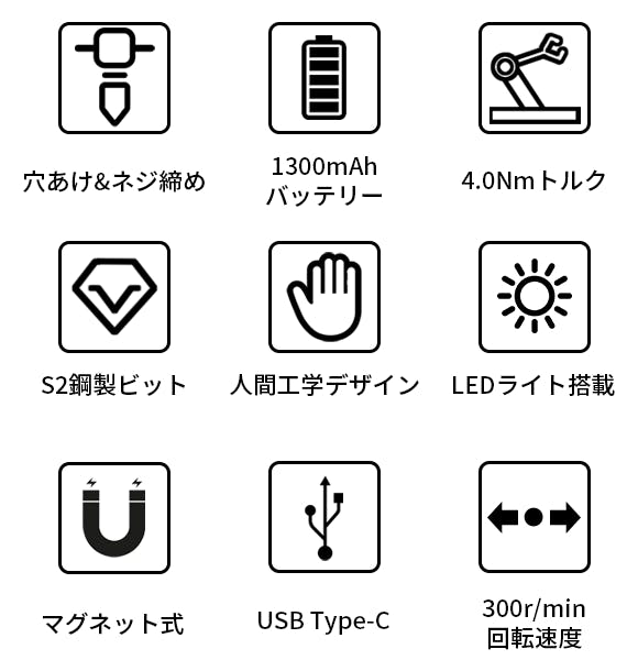 ※トルクとは回転軸を回転させる力のことで、数値が大きいほどネジを締める・緩めることが簡単になります。