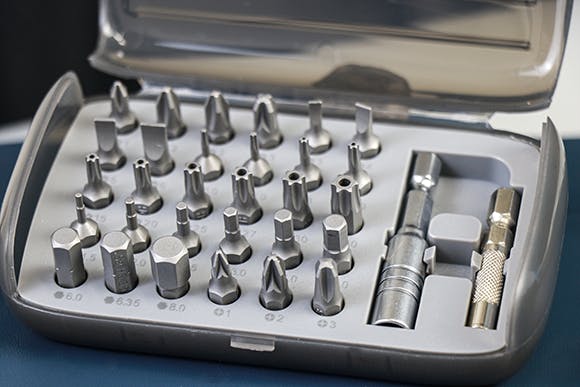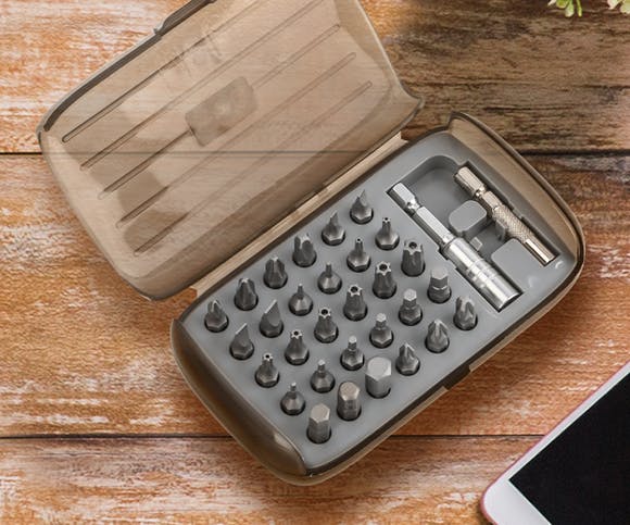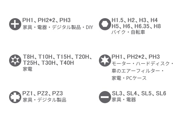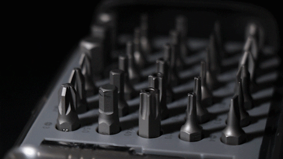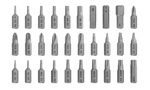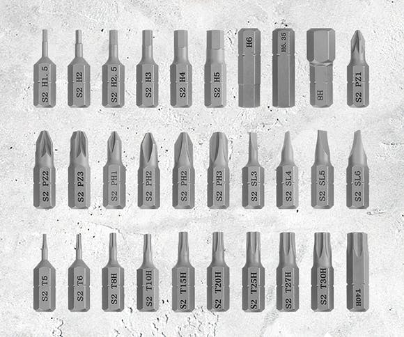 付属の30種類のビット(6.35mm)は家庭用のほとんどのニーズに対応できるS2合金で作られています。硬度は60HRCで非常に丈夫で、腐食にも強くて長持ちします。
