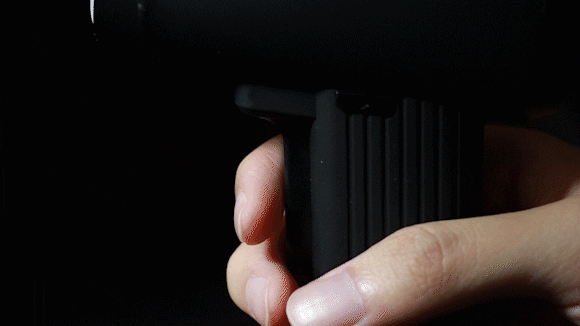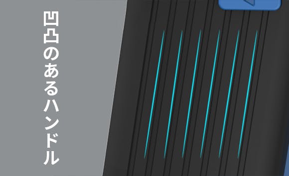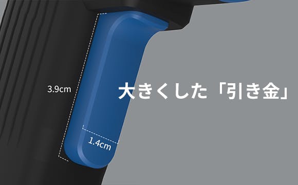 人間工学に基づいたピストル型のデザインは使用者の手のひらにぴったりフィットし、手に負担をかけず作業することが可能です。また、スイッチである「引き金」部分の面積を大きくしたので、あまり力を使わなくてもちゃんと押せます。さらに、使用中に手や指が滑らないようにするため、凹凸のあるハンドル設計に仕上げました。