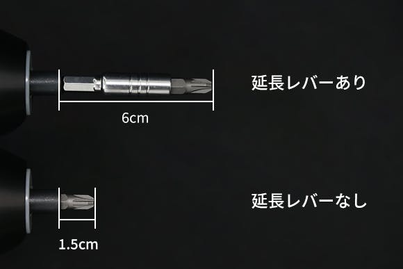 付属の延長レバーでビットの長さを一気に伸ばし、届かない深い場所のネジでも容易に回すことができます。