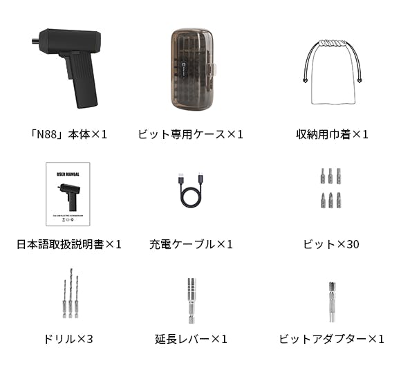 「N88」の付属品として、30種のビットのほか、ドリルも3本用意しました。ネジ回しだけではなく、一般的なドライバーができない穴あけも可能になりました。「N88」さえあれば、DIY作業の幅が一気に大きく広がります。