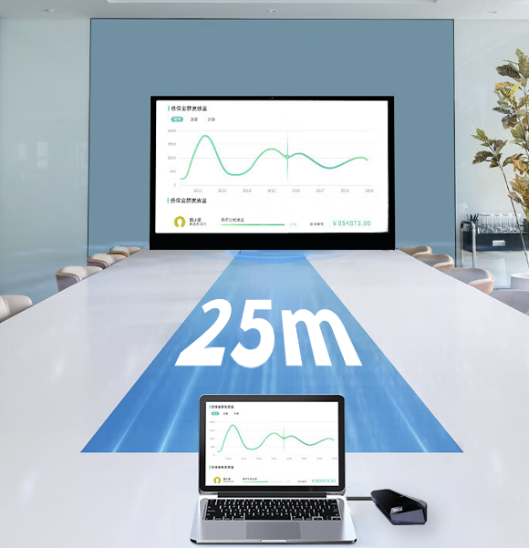 A:伝送先デバイスとの間に障害物がない場合、最大25メートル伝送可能です。映像の鮮明さと円滑性を確保するため、障害物が少ない環境でご使用ください。