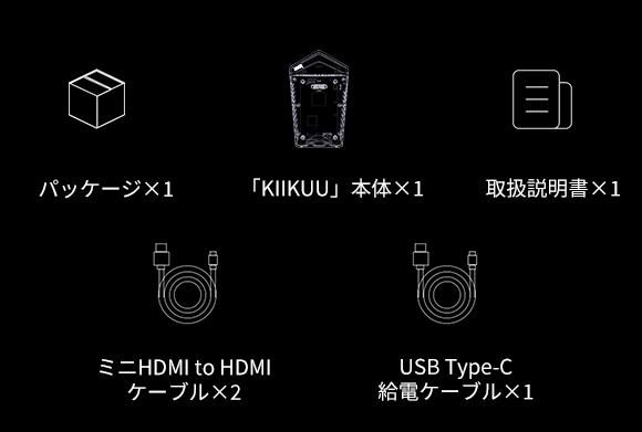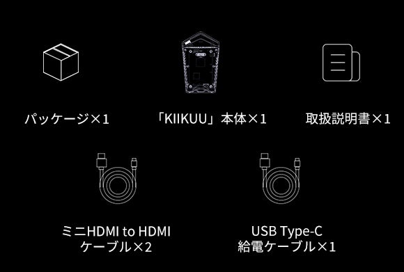 ①付属のHDMI toミニ HDMIケーブルでHDMI出力デバイス(ゲーム機・PCなど)のHDMIポートを「KIIKUU」のミニHDMIポートに接続します。