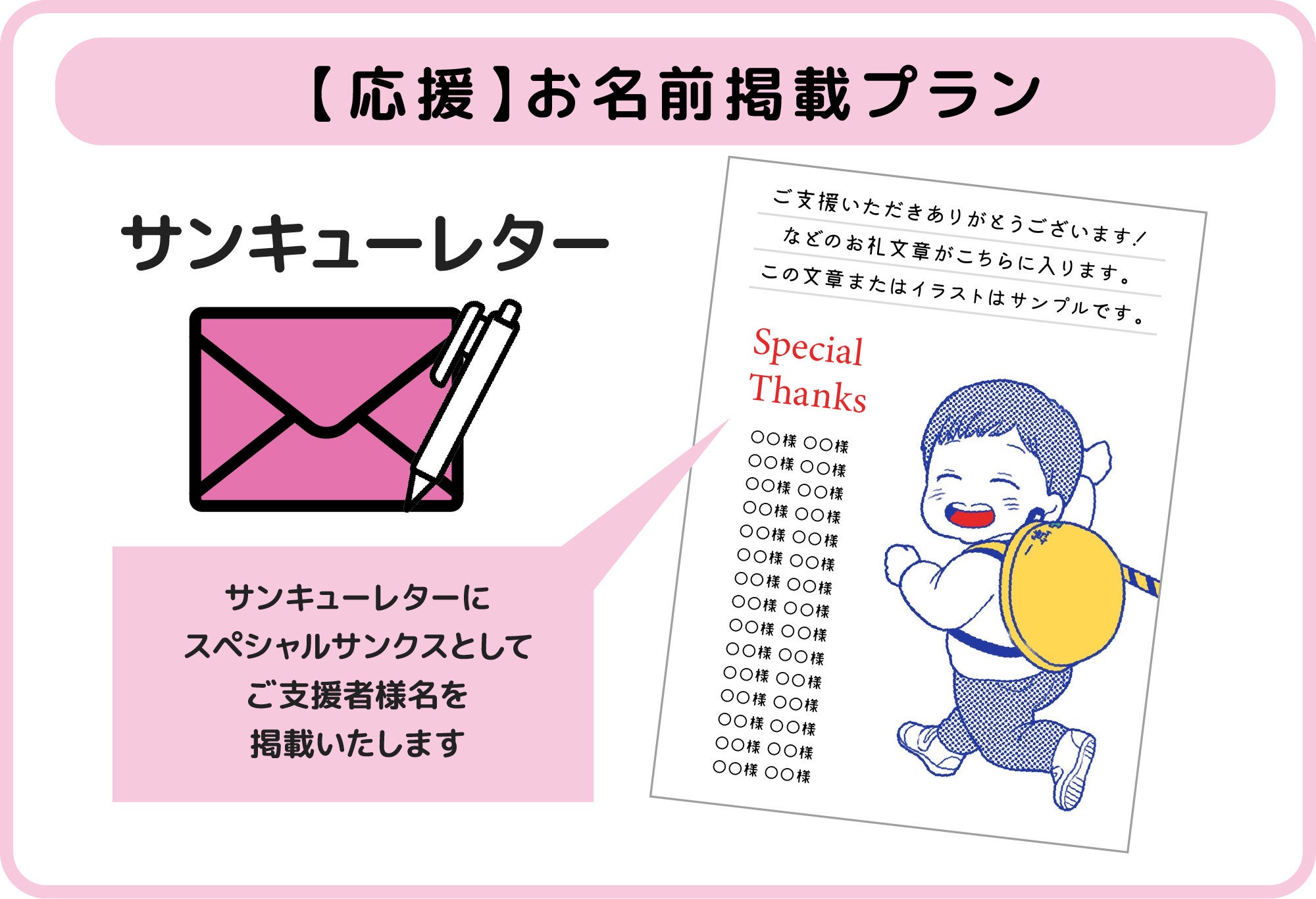 ご支援者様のお名前をスペシャルサンクスとしてサンキューレターに掲載させていただきます。
