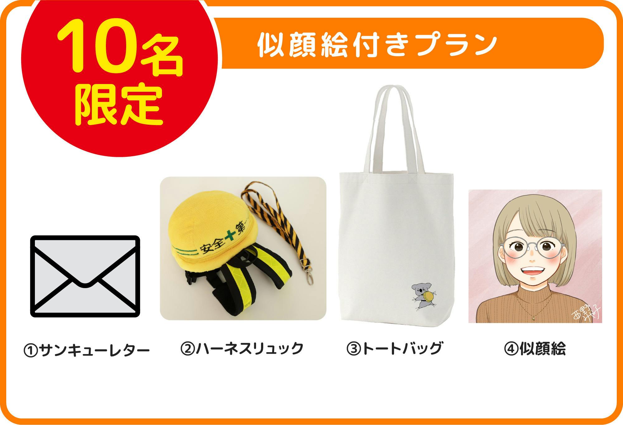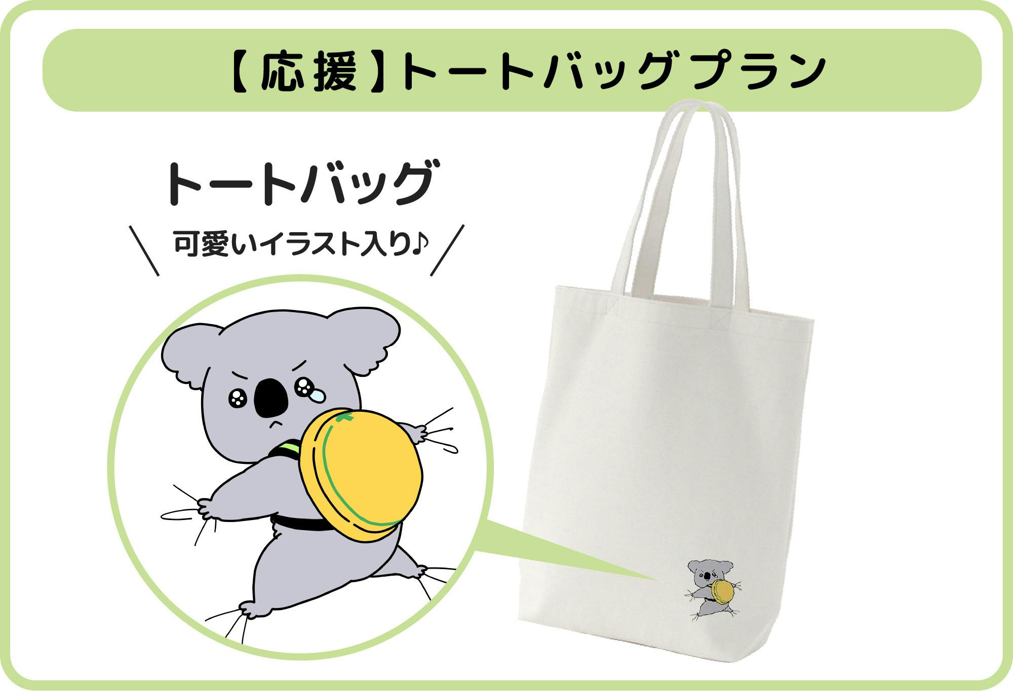 感謝の気持ちを込めて、このプロジェクトのために書き下ろしたイラストを施したオリジナルトートバックのプランです。ワンポイントなので日常使いしやすく、ちょっとしたおでかけにピッタリです。