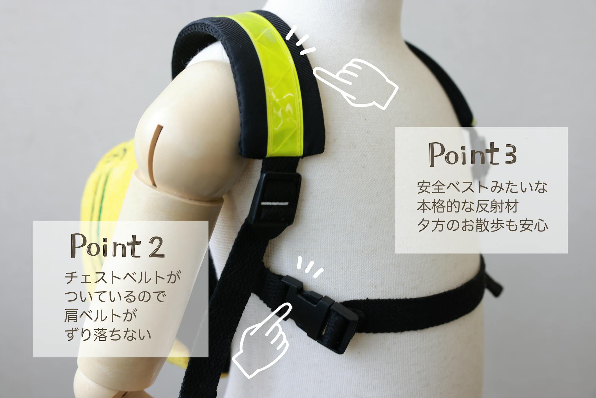 肩紐には暗くなったときに気づいてもらえるように安全ベストのような本格的な反射材を。