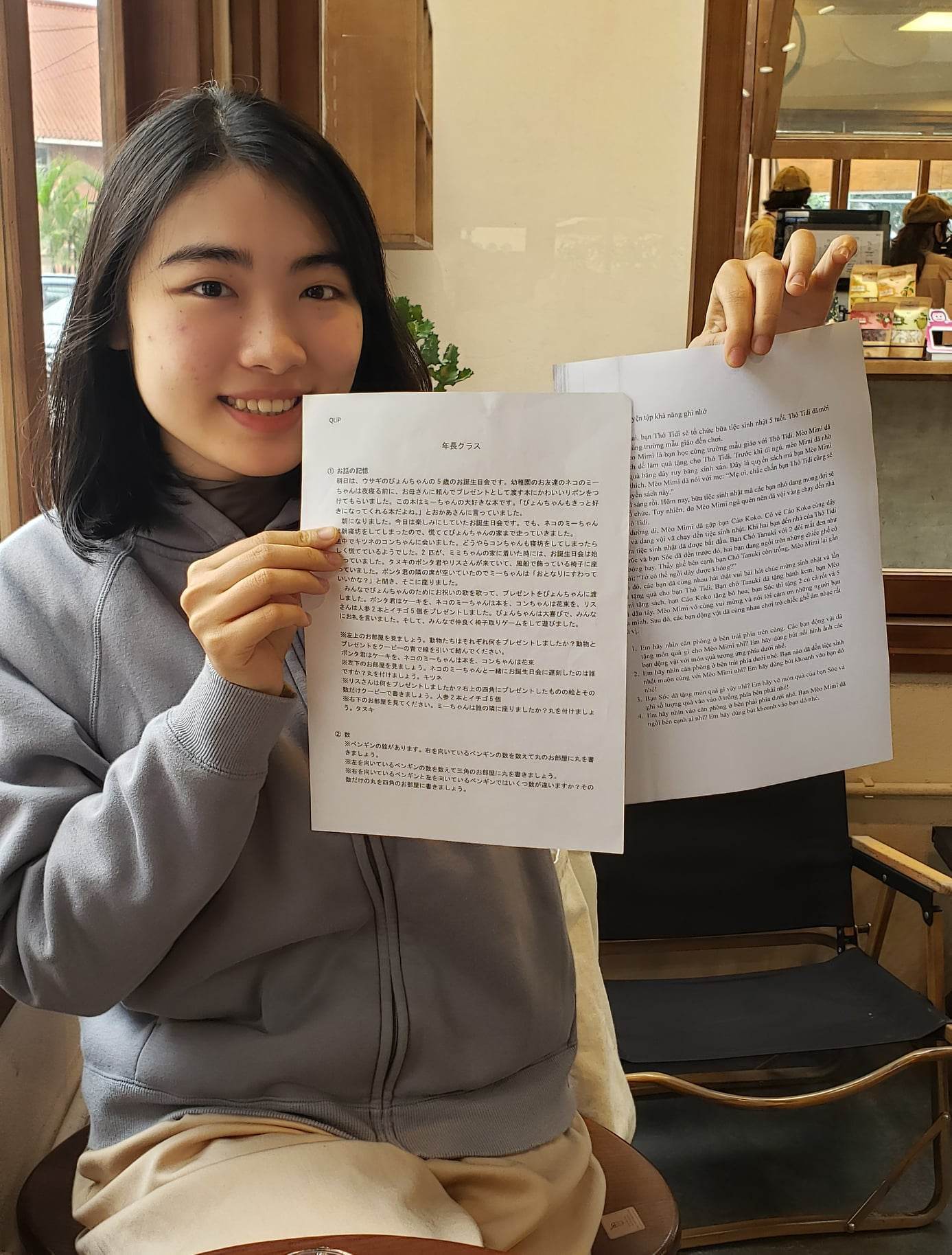 ベトナム国家大学日本語学科のチャーさんがテキストのサンプル翻訳に協力してくれました。お話の記憶というテキストで、短い物語を聞き内容について記憶を元に答えるというものです。動物の呼び名などもベトナム風の名前に変えてくれました。チャーさん、ありがとうございました。