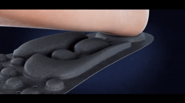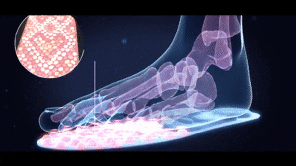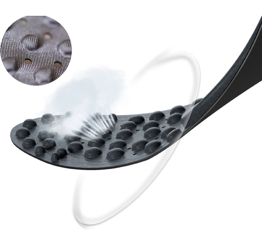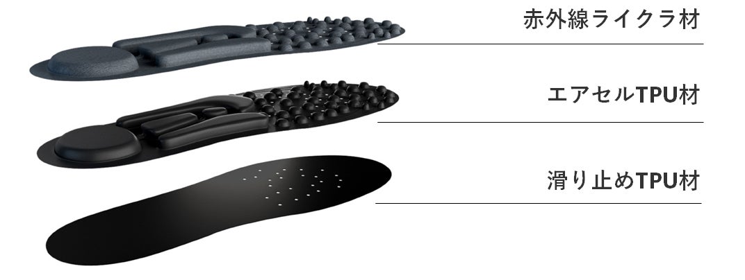 独⾃の3層構造で優れたクッション性とエアセル間の溝で⾼い通気性を備え、熱のこもり、蒸れ、臭いを防ぎます。⾜に触れる層には⾚外線が含まれており、細菌の繁殖を抑え、抗菌、防臭、消臭の効果が期待できます。遠⾚外線は⾼い抗菌性と防臭性であなたの⾜を快適に保ちます。